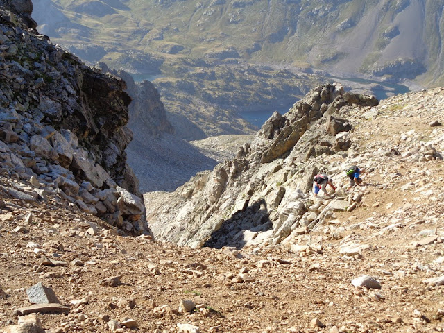 Comenzamos el largo descenso hacia los Ibones de Arriel, hay que fijarse bien en los hitos para bajar por el mejor sitio posible.
