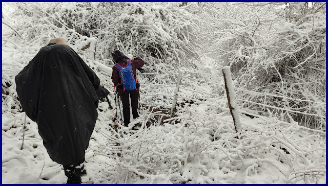 Comienza a nevar, mientras continuamos ascendiendo siguiendo el sendero señalizado con puntos naranjas